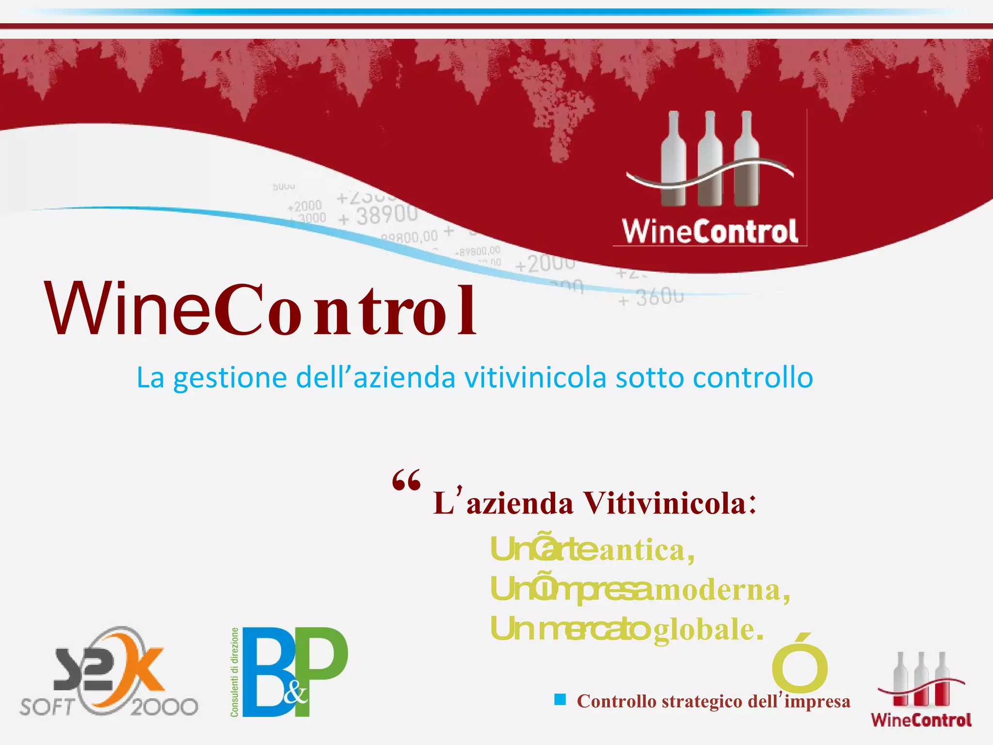 Winecontrol è un software innovativo sviluppato da Soft2ooo e Brogi & Pittalis per gestire le aziende vitivinicole, determinando il costo di produzione del vino e analizzando la salute gestionale. Interfacciabile con ERP e sistemi di produzione, offre strumenti per il controllo strategico, individuando aree di inefficienza e supportando la determinazione dei listini di vendita. I vantaggi include un miglioramento dell'efficienza produttiva e una gestione consapevole delle leve di marketing.