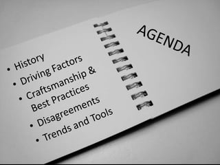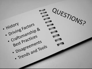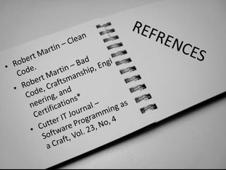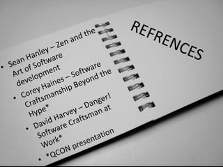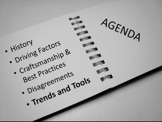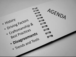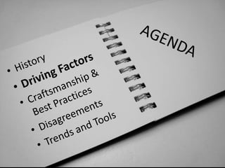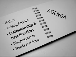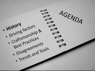 The document discusses the history and principles of software craftsmanship. It outlines how software craftsmanship values not only working software but well-crafted software, and focuses on steadily adding value through a community of professionals. The document presents the Manifesto of Software Craftsmanship and its emphasis on technical excellence, good design, automation, clean code, and continuous improvement.