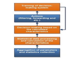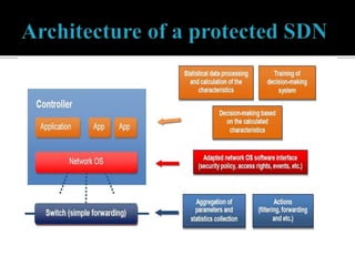 This document discusses SDN and network security. It proposes an anomaly detection algorithm to identify malicious activity on an SDN network. The algorithm involves collecting switch statistics, processing the data using time-series analysis, making decisions with fuzzy logic, and training the system with short-term and long-term learning modules. It also describes implementing two SDN security applications: TRW-CB for detecting SYN flooding attacks and rate limiting to control bursty traffic. The document concludes that SDN provides opportunities for effective network security through technologies like OpenFlow.