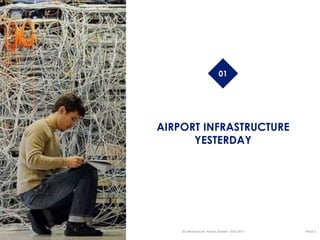 The document discusses software defined infrastructure and how it can be implemented at airports. It describes how infrastructure used to be comprised of separate hardware components from different vendors, which was difficult to manage. Software defined infrastructure abstracts the control plane from the hardware and uses open APIs, virtualization, and centralized management to allow any application to run on any infrastructure. This makes infrastructure more scalable, flexible, and cost effective. The document provides examples of software defined infrastructure products and outlines steps to establish this at airports.