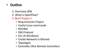 This document provides an overview of software-defined networking (SDN) and network functions virtualization (NFV). It discusses the motivation for SDN and NFV, including making networks more flexible and reducing costs. Key benefits mentioned are reduced equipment costs, increased speed of service deployment, and more flexible allocation of network resources. OpenFlow is introduced as an SDN protocol. The relationship between SDN and NFV is explored, noting they are complementary approaches. Examples of potential applications of NFV are listed.