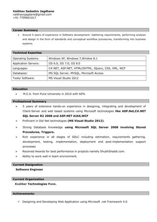 Vaibhav Jagdhane has over 5 years of experience developing software using technologies like C#.NET, ASP.NET, SQL Server, and Visual Studio. He has experience designing and developing web applications, including diagnostic solutions, ERP systems, agriculture processes, online stores, and matrimonial sites. His responsibilities include gathering requirements, designing interfaces, database development, validation, and testing. He is proficient in .NET frameworks and technologies and has received awards for his work.