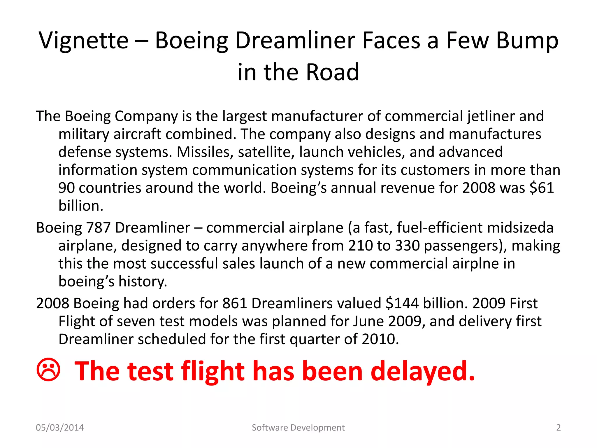 The Boeing 787 Dreamliner faced delays in its first test flight and deliveries. Issues included incomplete work from contractors, a 25-day strike at Boeing in 2008, and problems with the software controlling the aircraft's braking system. Customers had penalty clauses in their contracts for late delivery, costing Boeing hundreds of millions of dollars. Further details on the software issues, their impacts, and Boeing's responses were not provided in the document.