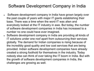 Software development companies in India have grown significantly in recent years, establishing the country as a major global outsourcing hub. They provide a wide range of high quality IT solutions at low costs. The industry faces challenges from increasing competition as companies strive to outperform each other. To succeed, software development companies must balance quality, costs, and project management while developing technical and business skills among their workforce.
