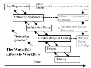 The document discusses several software development life cycle (SDLC) models including waterfall, V-shaped, prototyping, rapid application development (RAD), incremental, spiral, and timeboxing. It provides descriptions of each model including typical steps, strengths, weaknesses, and when each model is best suited. It also discusses capability maturity model (CMM) levels and how changing the lifecycle model can impact development speed, quality, visibility, overhead, risk, and customer relations.