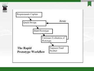 The document discusses several software development life cycle (SDLC) models including waterfall, V-shaped, prototyping, incremental, spiral, rapid application development (RAD), dynamic systems development method (DSDM), adaptive software development, and agile methods. It provides an overview of the key characteristics, strengths, weaknesses, and types of projects that each model is best suited for. Tailored SDLC models are recommended to customize processes based on specific project needs and risks.