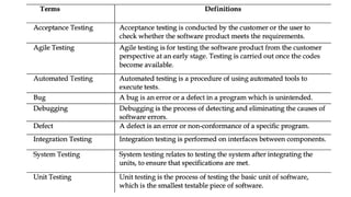The document discusses the software development lifecycle (SDLC), detailing its phases and the importance of testing throughout the process to ensure software quality and reliability. It highlights various software development models, including waterfall, v, spiral, and agile, with a focus on testing's integral role in mitigating risks and identifying defects. Additionally, it refers to the well-known Intel Pentium bug incident and its implications on customer trust and software quality practices.