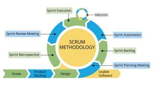 This document provides an overview of software development methodologies including agile, Scrum, Extreme Programming (XP), and DevOps. It defines these methodologies and compares their processes and practices. The main agile methodologies discussed are Scrum and XP. It notes that agile is an iterative approach that builds software incrementally to satisfy customers, accept changes, and focus on collaboration and testing. Scrum is described as the most common agile process using sprints, with roles like the product owner and team leader. DevOps is defined as a combination of practices that increase speed of delivery through continuous development, testing, integration, deployment and monitoring.