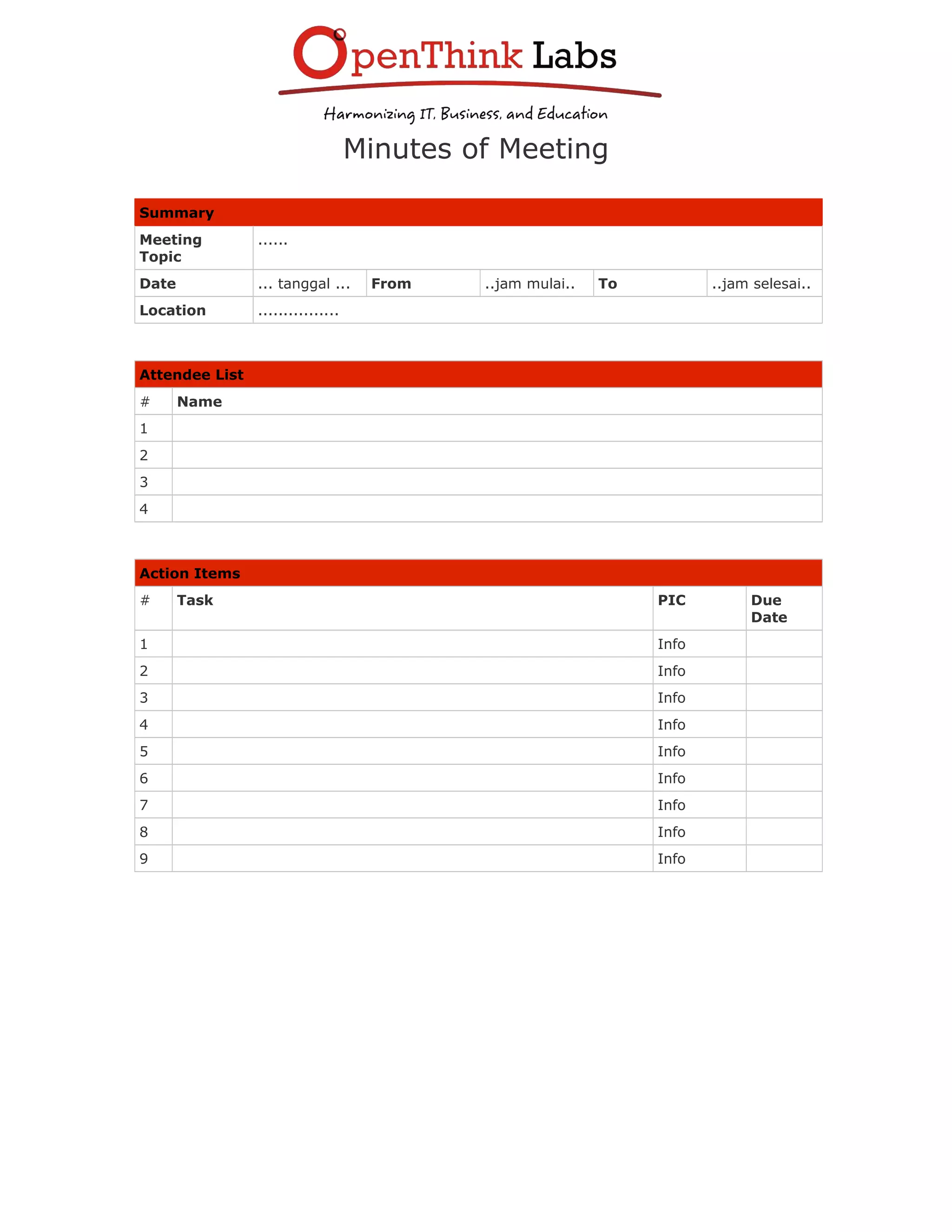 The minutes document the details of a meeting that took place from a start time to an end time on a specific date at a certain location. It lists the names of attendees and action items with task descriptions and the people in charge of completing each task by the due dates.