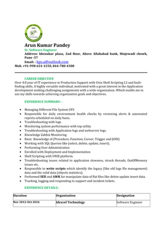 Arun Kumar Pandey is a Senior Software Engineer with over 4.8 years of IT experience in production support, specializing in UNIX shell scripting and troubleshooting. He has worked on significant projects involving application development and support for high-availability systems, including automated attendance systems and enterprise content management. Arun holds a BCA degree, is fluent in English and Hindi, and is currently based in Bangalore.