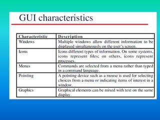 This document discusses user interface design for software systems. It notes that users often judge systems by their interfaces and poor interface design can lead to errors. Most business systems now use graphical user interfaces (GUIs) which are easy to learn and use. The document advocates for user-centered design where users' needs are paramount. It outlines the user interface design process and principles such as consistency, minimizing surprises, and supporting error recovery. Design principles also include making interfaces familiar to users and providing guidance for a diverse user base.