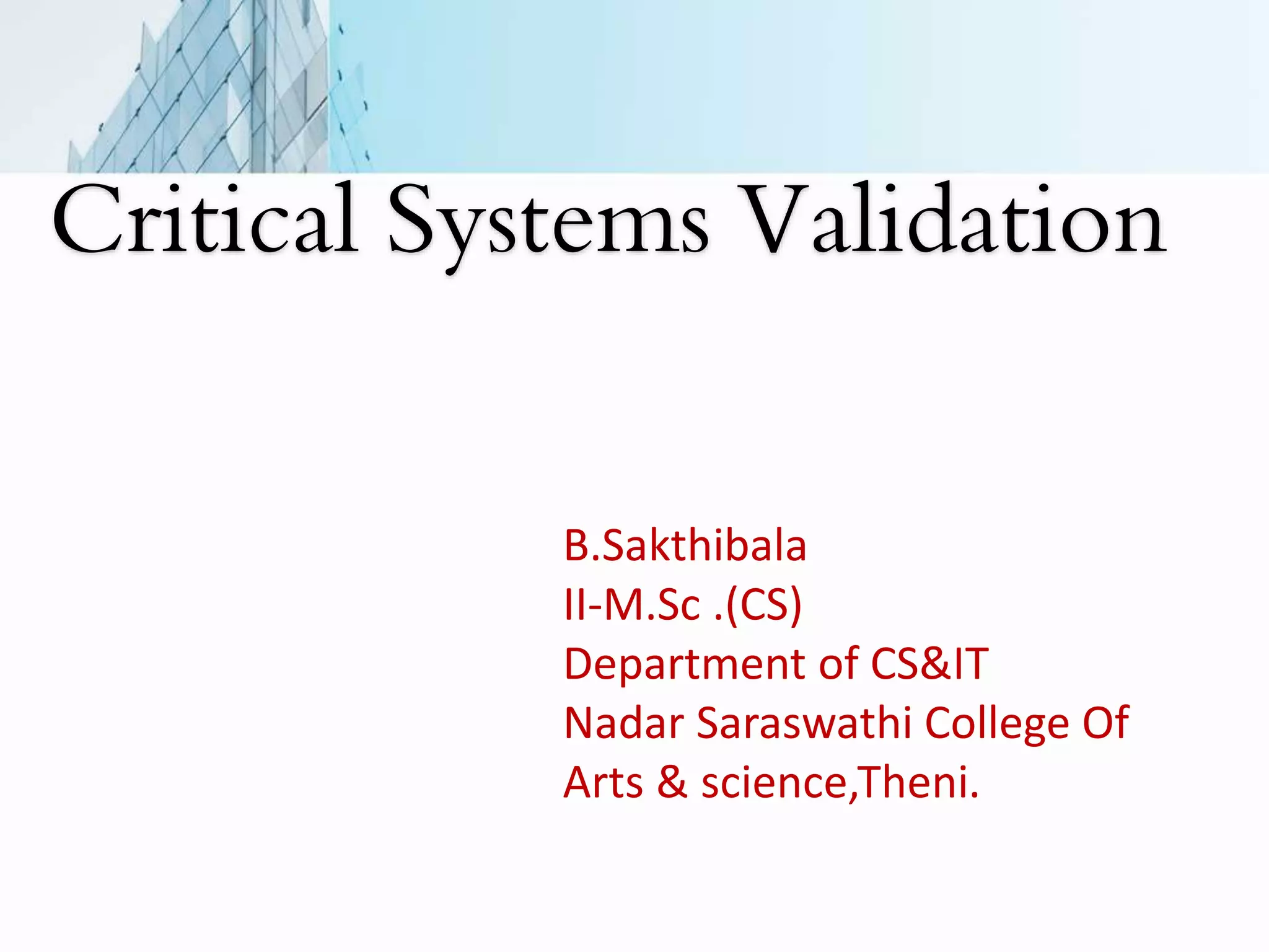 The document discusses validation processes for critical systems, including reliability validation, safety assurance, security assessment, and developing safety and dependability cases. Validation of critical systems involves additional processes compared to non-critical systems, such as formal validation to demonstrate that requirements are met to regulators' satisfaction. Reliability validation assesses whether a system meets required reliability levels through representative testing, while safety assurance establishes confidence in a system's safety through processes, validation techniques, and reviews. Security assessment and safety assurance both aim to demonstrate that systems cannot enter unsafe or insecure states. Safety and dependability cases make detailed arguments through evidence that systems achieve required safety levels.