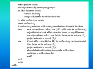 This document discusses software cost estimation. It explains that software is often the most expensive part of computer systems. Estimation is not exact due to many variables that can affect costs. Cost and effort can be estimated by decomposing projects into functions and activities. Accuracy depends on properly estimating size, translating size to effort/costs, reflecting team abilities, and stable requirements. Estimation techniques include lines of code (LOC), function points (FP), and decomposing processes into tasks to estimate effort for each. Matrices are used to estimate costs based on size, productivity rates, and effort estimates.