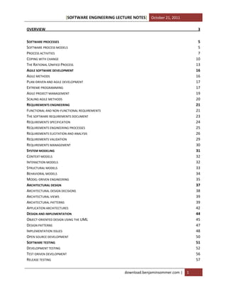This document provides an overview of key concepts in software engineering including software processes, process models, activities, and coping with change. It discusses the waterfall model, incremental development, and reuse-oriented processes. The main activities of software specification, design and implementation, validation, and evolution are described. The document also briefly introduces topics like requirements engineering, system modeling, architectural design, testing, and software maintenance.
