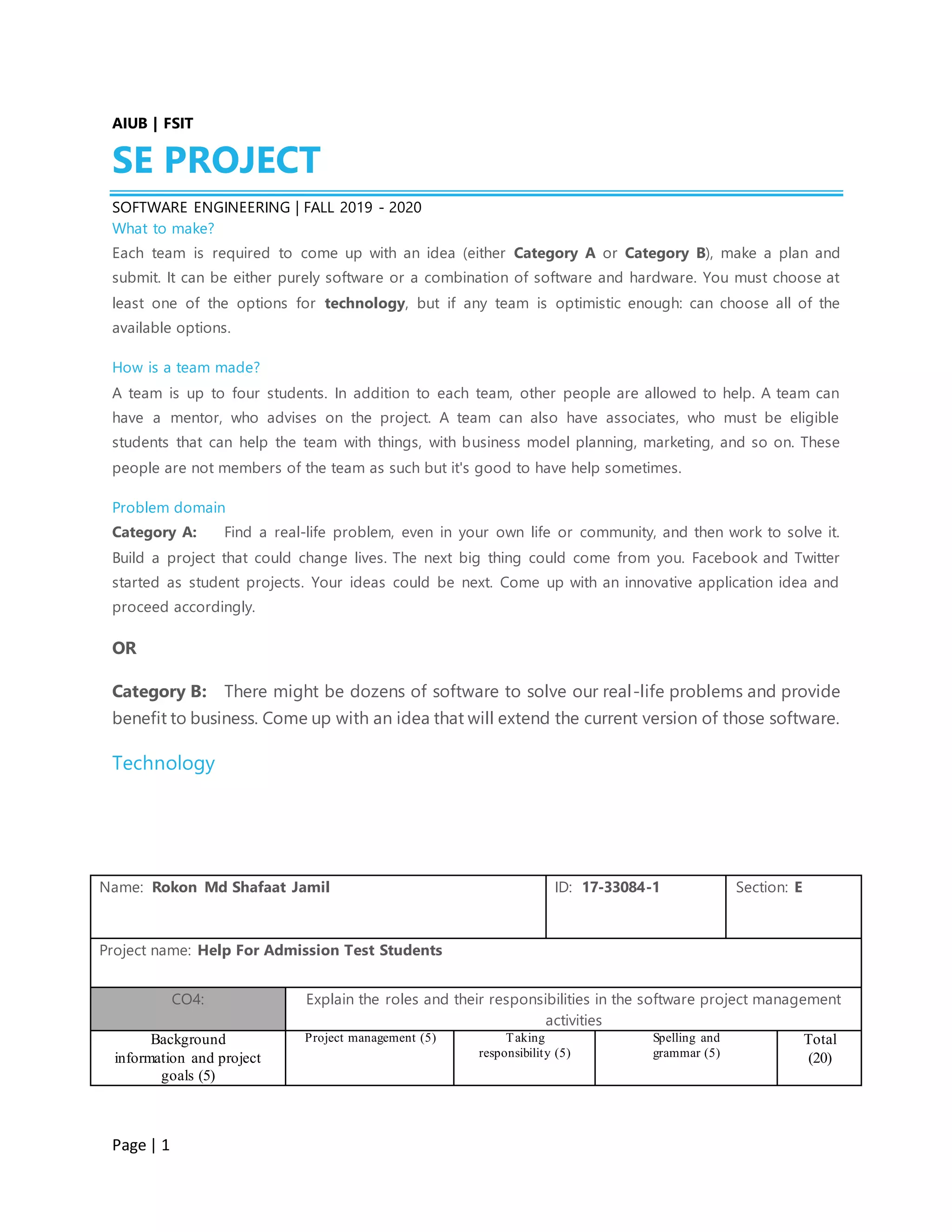The document outlines a software engineering project for students, where teams must develop a solution addressing real-life problems. It describes project requirements, team roles, expected functionalities, including user interactions and challenges such as budgeting and risk analysis. The primary goal is to create an application aiding students preparing for admission tests by connecting them with local assistance and accommodations.