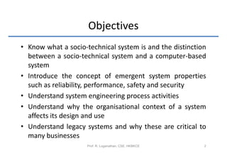 The document discusses socio-technical systems and their key differences from technical computer systems. Socio-technical systems include technical, organizational and human elements. Emergent properties like reliability depend on complex interactions between system components and are difficult to predict. Systems engineering aims to design socio-technical systems to meet requirements while accounting for organizational factors. Legacy systems also present challenges due to their critical role and difficulty evolving over time.