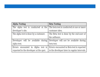 The document outlines software testing principles, techniques, and the importance of testing in software development. It distinguishes between debugging and testing, emphasizes the need for test planning, and describes various testing strategies such as black-box and white-box testing. Testing ensures software meets specifications, identifies defects, and maintains product quality, ultimately enhancing customer satisfaction.