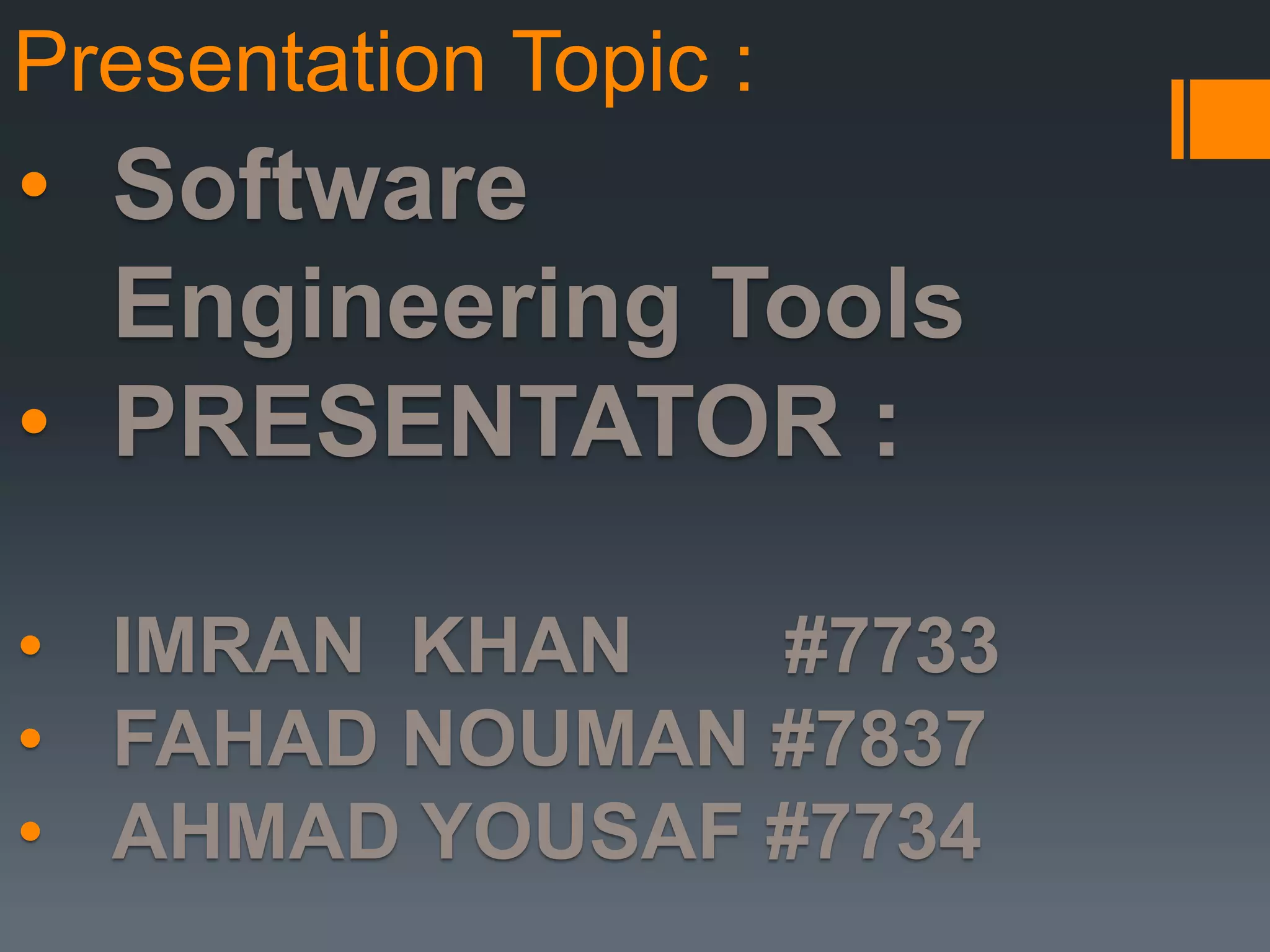 This document discusses various software engineering tools used at different stages of the software development lifecycle. It outlines tools for database development, programming, web development, software configuration management, design and analysis, and testing. Database tools like Oracle and MySQL are used to store and manage application data. Programming tools include IDEs and libraries that help with coding. Web development tools assist with designing web pages. SCM tools cover source control, building, installation, and defect tracking. Common design tools include data flow diagrams. Software testing tools help automate testing tasks.