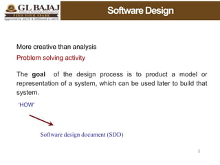 The document discusses the principles of software design, emphasizing that a good design is critical for successful software development. It outlines key characteristics of effective design, including correctness, understandability, efficiency, and maintainability, while contrasting good design with bad design on various attributes. The text also explains the concepts of coupling and cohesion, highlighting their impact on module independence and overall system stability.