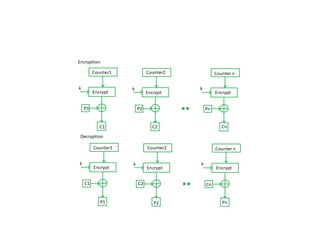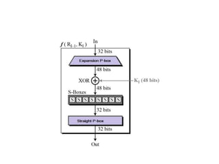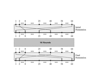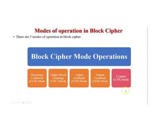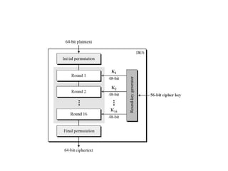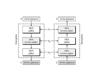 The document provides an overview of various encryption standards, namely DES, Triple DES, and AES, detailing their structures, key management, and modes of operation. DES is a symmetric-key block cipher with a 56-bit effective key length, while Triple DES enhances security by applying DES three times with different keys. AES, considered superior, employs a substitution-permutation network with variable rounds based on key length, and has gained wide adoption due to its speed and robustness against cryptanalysis.