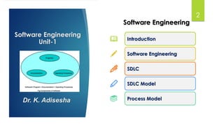The document provides an introduction to software engineering and discusses software, software engineering, the software development life cycle (SDLC), and SDLC models. It defines software and its components. It describes software engineering goals and challenges. It explains the SDLC phases including feasibility study, requirements analysis, design, development, testing, deployment, and maintenance. It discusses various SDLC models like waterfall, iterative, prototype, spiral, and agile models.