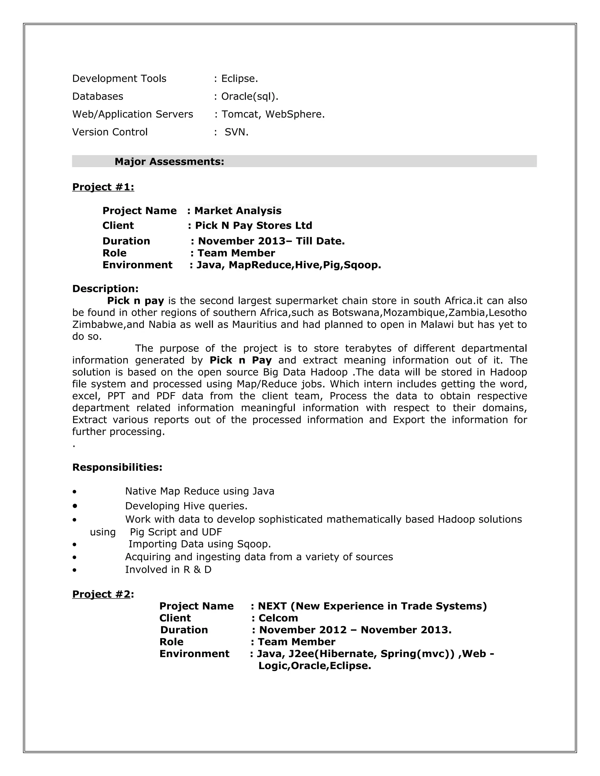 The document provides a summary of Ravi Mobile's professional experience working as a Hadoop Developer for over 2 years. It outlines his expertise in Big Data technologies like Hadoop, HDFS, MapReduce, Hive and Pig. It also lists 3 projects he worked on, including developing MapReduce programs and Hive queries for a market analysis project and enhancing a Spring application for a cell phone service provider.