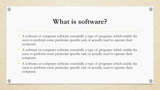 This document discusses different types of software. It defines software as programs that enable users to perform tasks and operate computers. There are two main types of software: system software and application software. System software includes operating systems, device drivers, firmware and utilities, which help manage computer hardware and resources. Application software includes programs for specific tasks like word processing, databases, and multimedia. Common examples of each type are provided.