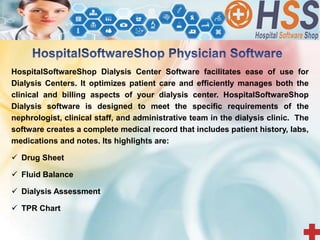 HospitalSoftwareshop offers dialysis center software that enhances patient care and manages clinical and billing operations efficiently. The software is tailored for nephrologists and clinic staff, providing features like patient records management, billing generation, and easy access to clinical data. Additionally, the company provides a wide range of healthcare software solutions and is expanding its presence both in India and internationally.