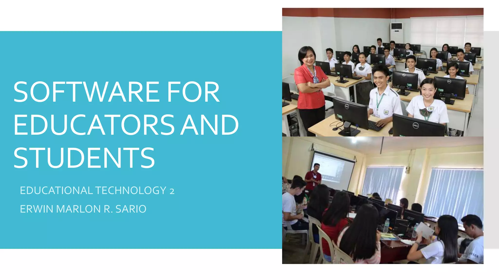 This document discusses software for educators and students. It describes two types of software: system software, which controls computer operations and interfaces with hardware; and application software, which allows users to perform specific tasks. Some examples of application software used in schools are instructional software, drill and practice software, simulations, word processing software, and presentation software. This software helps administrators, teachers and students meet educational goals and produce creative works.