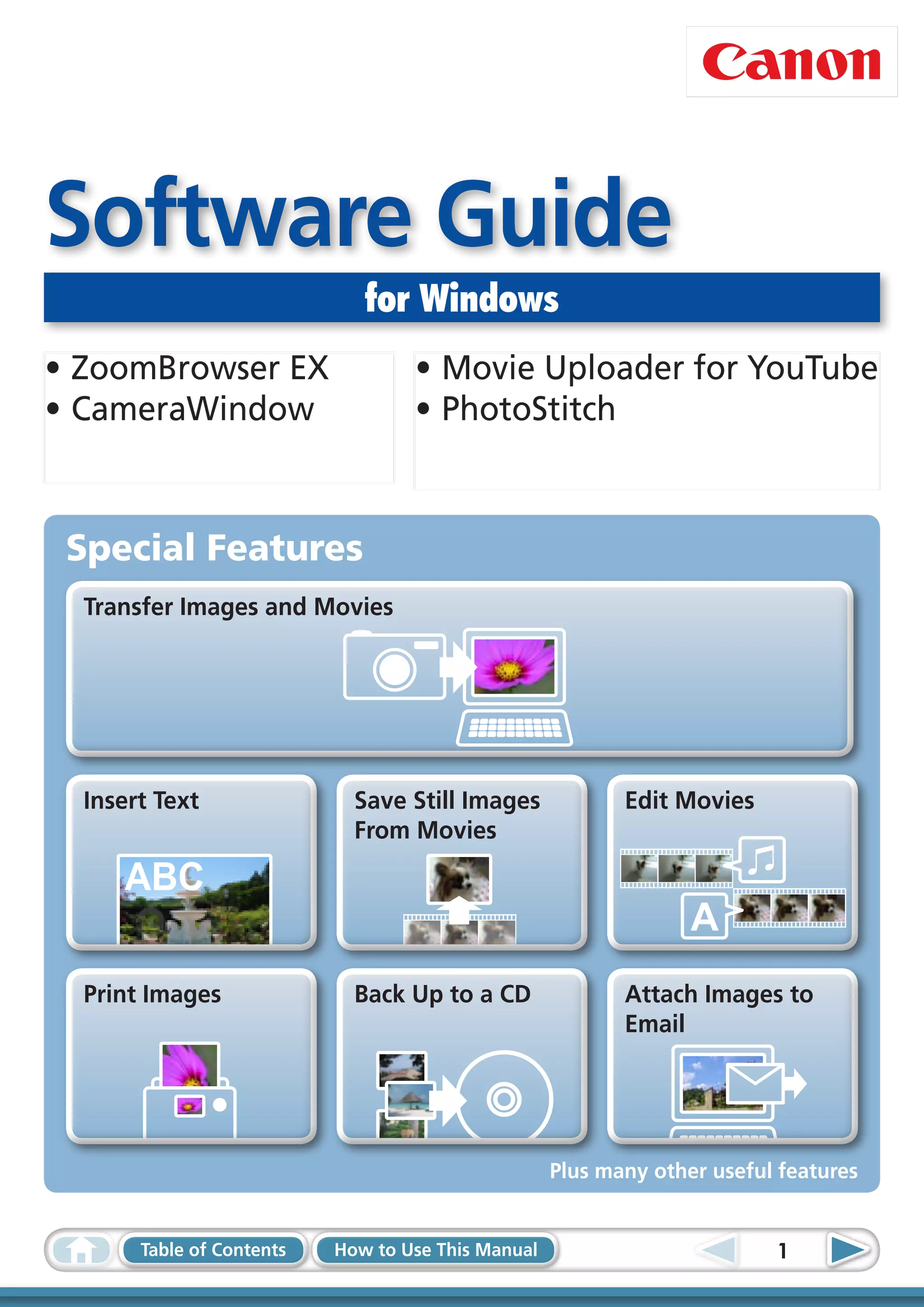 1. This document provides instructions for using software to transfer images and movies from a Canon camera to a computer, print photos, and edit images.