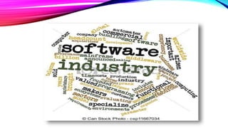 This document provides an overview of the software industry in India. It discusses that the software industry is one of the fastest growing industries globally and in India. The Indian software industry has experienced significant growth in exports and revenues in recent years. Some of the major regions for the software industry in India include Bangalore, Chennai, Hyderabad, Delhi, Mumbai and Pune. Key Indian software companies like Infosys, TCS and Wipro are discussed along with some of their major products. The SWOT analysis highlights strengths like skilled workforce but also weaknesses like infrastructure challenges and threats from other competing nations.