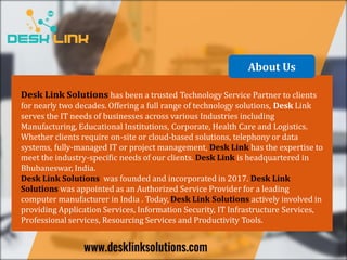 Desk Link Solutions is a technology service provider based in Bhubaneswar, India, offering a comprehensive range of IT solutions for various industries since its founding in 2017. The company specializes in areas such as data center management, network design, desktop management, and advanced security solutions, ensuring reliability and efficiency in IT operations. With a commitment to innovation, Desk Link Solutions caters to diverse global clients, helping them enhance productivity and security through tailored technology services.