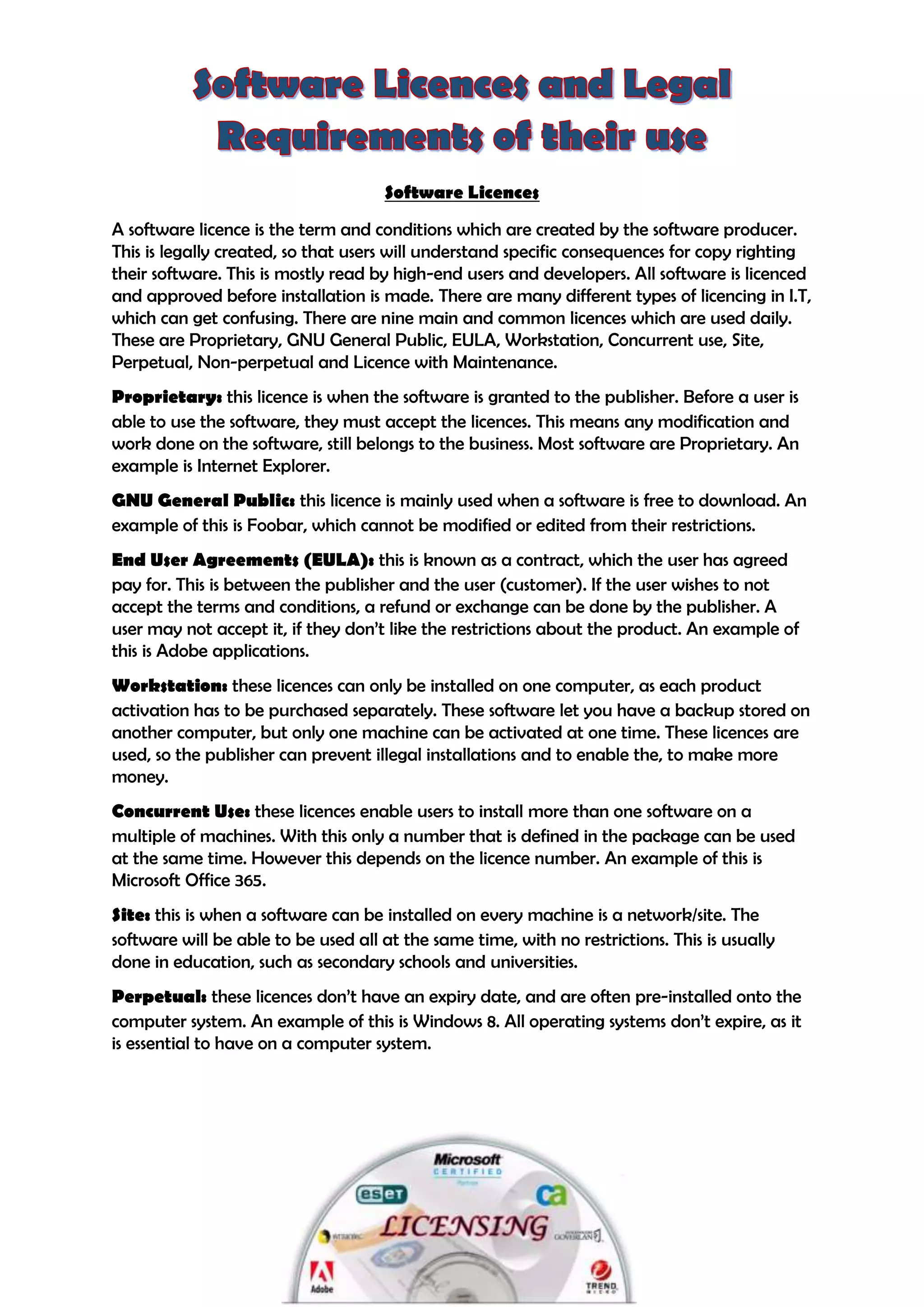 The document outlines various types of software licenses, including proprietary and GNU General Public licenses, and explains the importance of legal requirements in software usage, such as copyright laws and piracy control. It also discusses the processes involved in installing software, the benefits of registration for both users and developers, and the potential implications and benefits of installing software. Key points include ensuring legal compliance, maximizing user experience through updates, and the risks of downloading unverified software.