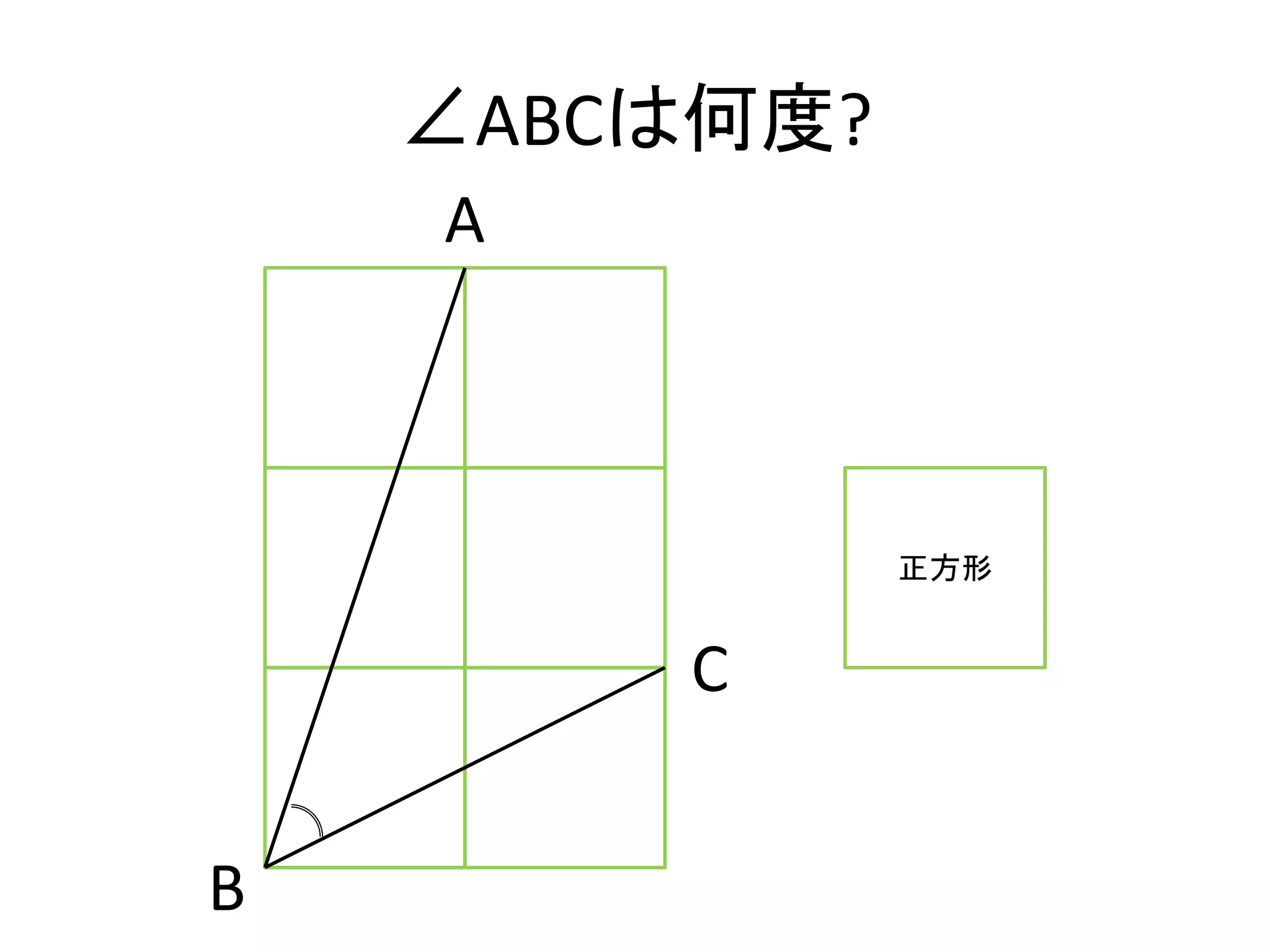 A D △ACD≡△CBEより AC=CB よって△ABCは二等辺三角形 ∠ACB=180°-∠ACD-∠BCE =180°-∠ACD-∠CAD =90° 二等辺三角形の底角は等しいので ∠ABC=∠BAC C ∴ ∠ABC=180°-∠BAC-∠ACD ∠ABC=180°-∠ABC-90° 2∠ABC=90° ∠ABC=45° B E