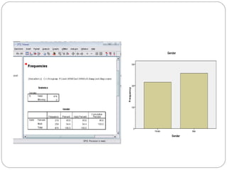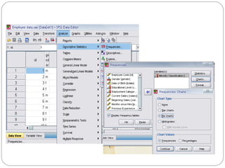 This document provides an overview of the Statistical Package for Social Sciences (SPSS). It discusses what SPSS is, how to define and enter variables, and the four main windows in SPSS including the data editor, output viewer, syntax editor, and script window. Basic functions like frequencies analysis, descriptives, and linear regression are also introduced.