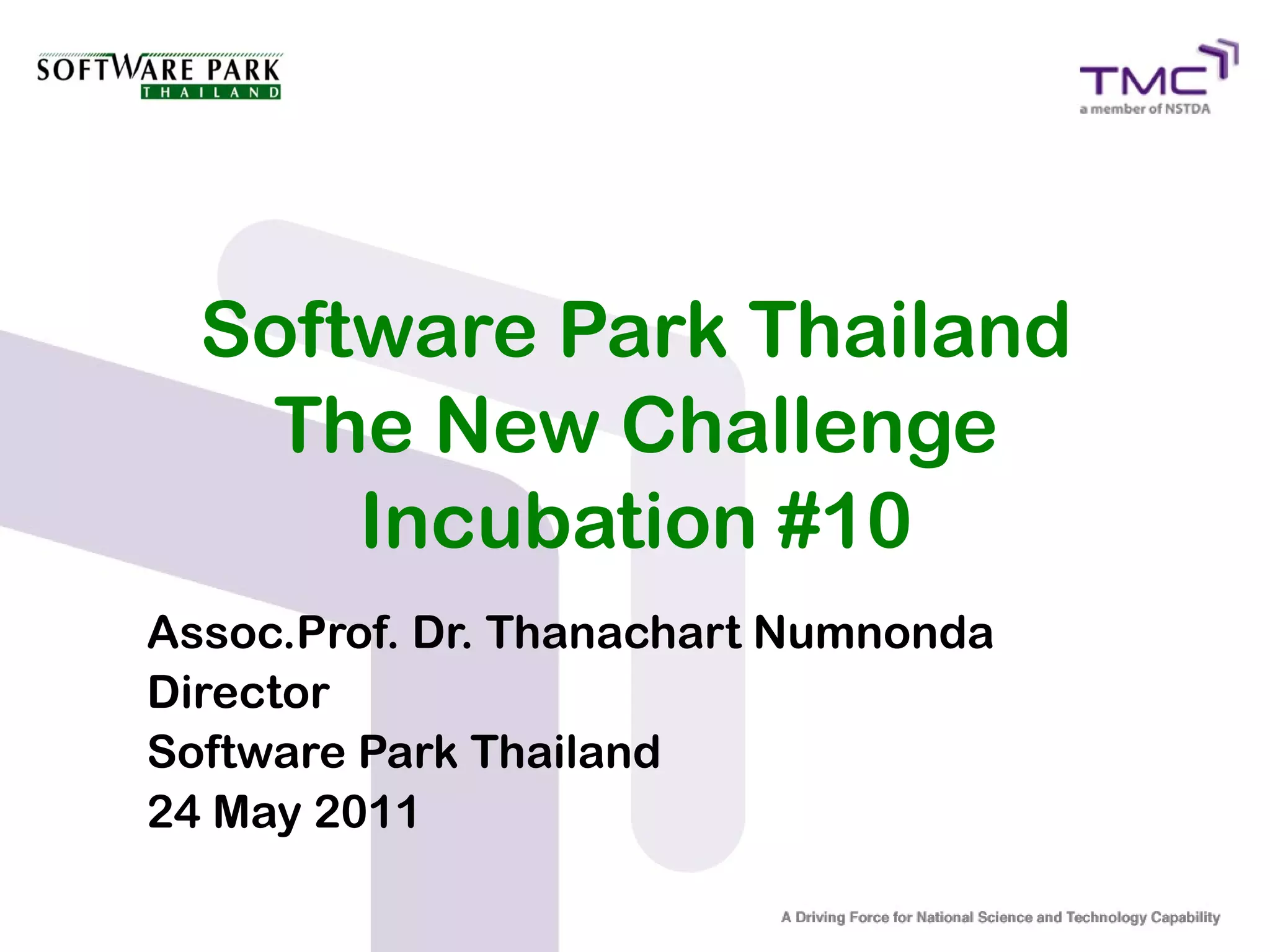 Software Park Thailand aims to foster innovation and collaboration within the Thai software industry by providing a platform for technology transfer and enabling services since its establishment in 1999. It emphasizes the importance of adapting to global trends such as cloud computing and mobile applications to enhance competitiveness and productivity across various sectors. The vision includes transforming into a community-focused platform leveraging digital and cloud technologies for the future of the software industry in Thailand.