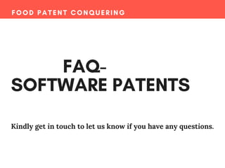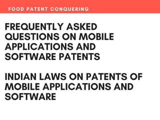 The document provides an overview of food patenting, particularly concerning software patents in India, including information about why one should patent software and the complexities involved in drafting patent applications. It highlights that software can be protected under intellectual property rights and discusses the factors influencing the patentability of software. The document encourages readers to consult a patent lawyer for more in-depth knowledge on the subject.