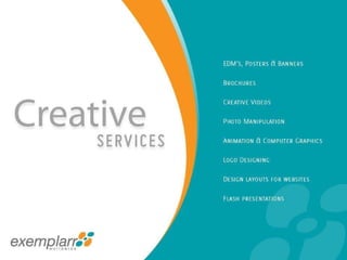 Exemplarr Worldwide is one of the fastest growing companies providing software development outsourcing services since 1999. It offers services like software development, product development, application migration, and maintenance using standard methodologies and processes. Exemplarr aims to provide high quality, cost-effective solutions using cutting-edge technologies and has experience in various domains like engineering, publishing, e-learning, and more.