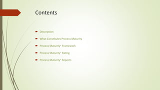 This document describes a new Software Process Maturity+ framework. It is designed for agile development and maintenance in today's rapidly changing software industry. The framework includes processes, practices, and maturity levels tailored for development, maintenance, and agile lifecycles. It also evaluates non-functional aspects like readability, complexity, and support. Organizations are evaluated across these dimensions and assigned a Process Maturity+ class rating from D to A. Reports provide detailed feedback on strengths and improvement areas to help organizations strengthen their processes.