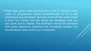 The document provides guidance on key questions to ask when hiring a mobile app developer, emphasizing the importance of selecting an experienced and reliable professional. It highlights the significance of reviewing previous projects and client references to ensure quality outcomes within budget and time constraints. Additionally, it cautions against developers who overly rely on open-source solutions and stresses the need for familiarity with relevant APIs for optimal app performance.