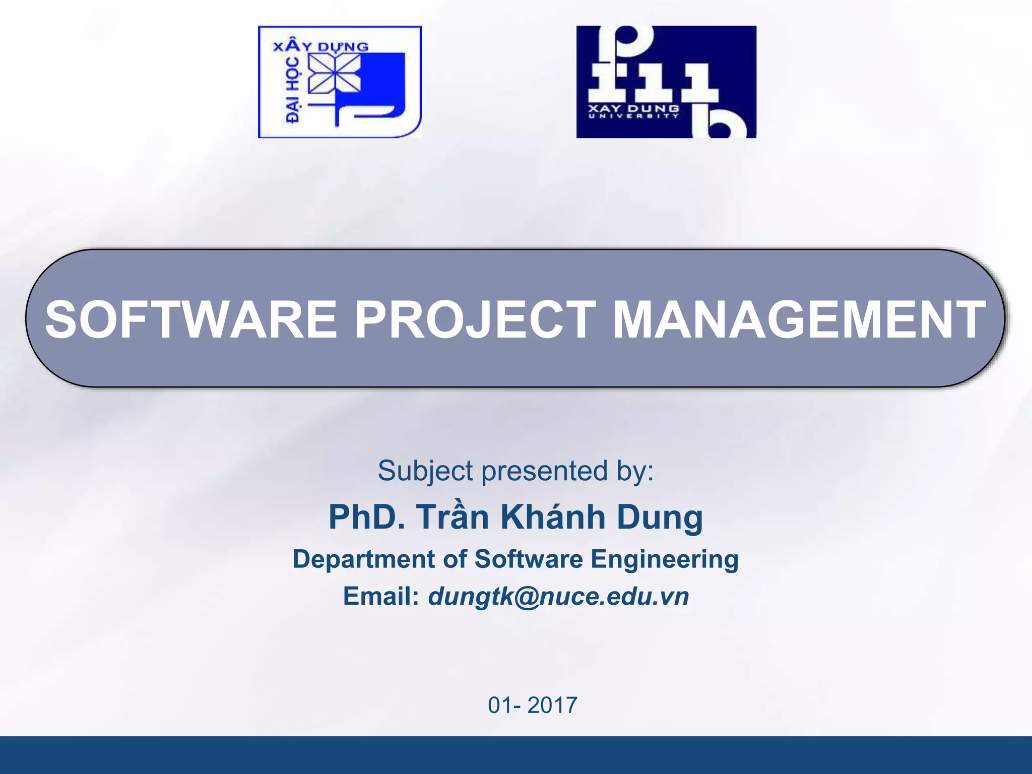 The document presentation by PhD. Trần Khánh Dung outlines key concepts and principles within software project management, highlighting the importance of effective management techniques for cost estimation, resource requirements, risk management, and quality control. It discusses the roles of various stakeholders in a software project, the critical factors for building high-performance teams, and provides insights into measurement metrics and project planning objectives. Additionally, it addresses the significance of risk analysis in managing both project and technical risks to ensure successful software delivery.