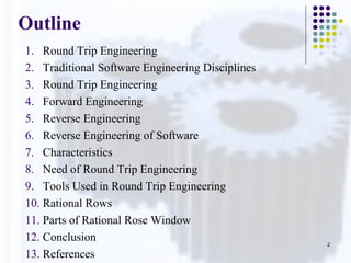 This document discusses round trip engineering. Round trip engineering synchronizes related software artifacts like source code and models so that changes made to one artifact are reflected in the others. It combines forward engineering, which creates software from specifications, and reverse engineering, which creates specifications from existing software. Round trip engineering allows moving between requirements, analysis, design, and implementation, and synchronizing changes made at any phase. Tools like Rational Rose support round trip engineering by automatically updating artifacts when inconsistencies are detected.