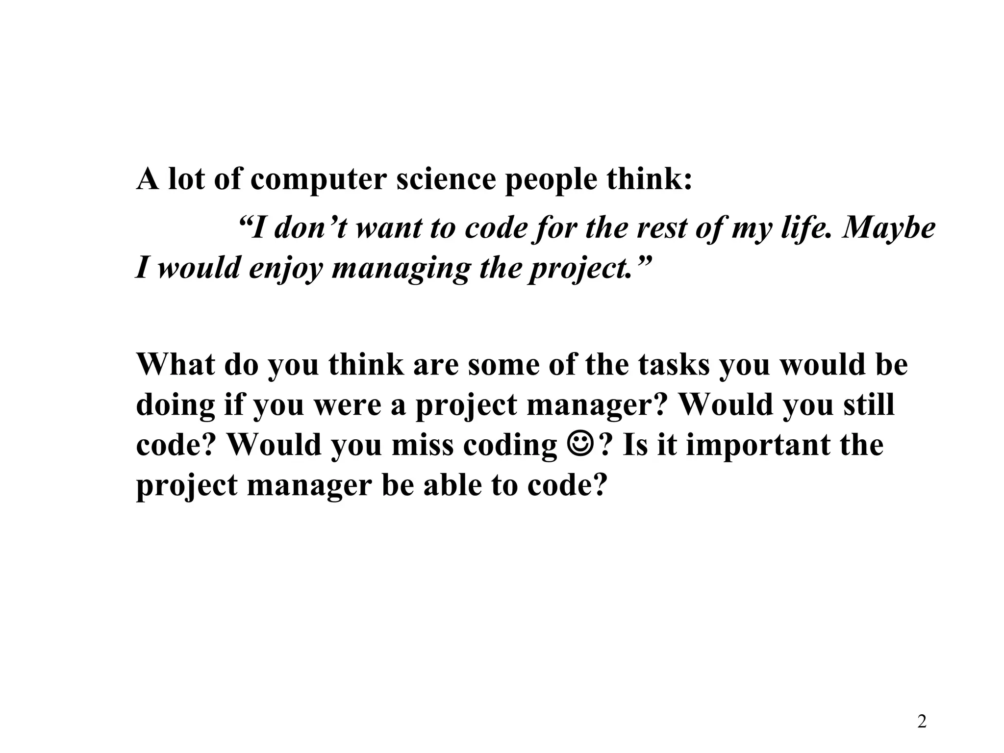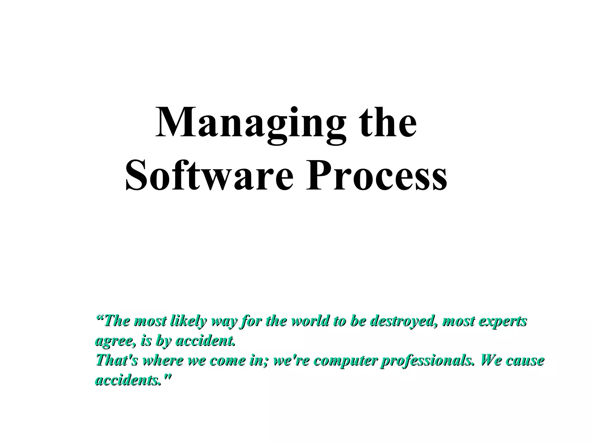 The document discusses various aspects of managing software projects and processes. It covers tasks that a project manager would be responsible for, including planning, scheduling, directing teams, and monitoring progress. It also discusses different software development models like the waterfall model and agile development. Project managers play an important role in planning projects, estimating costs and schedules, and building effective teams to complete software work.