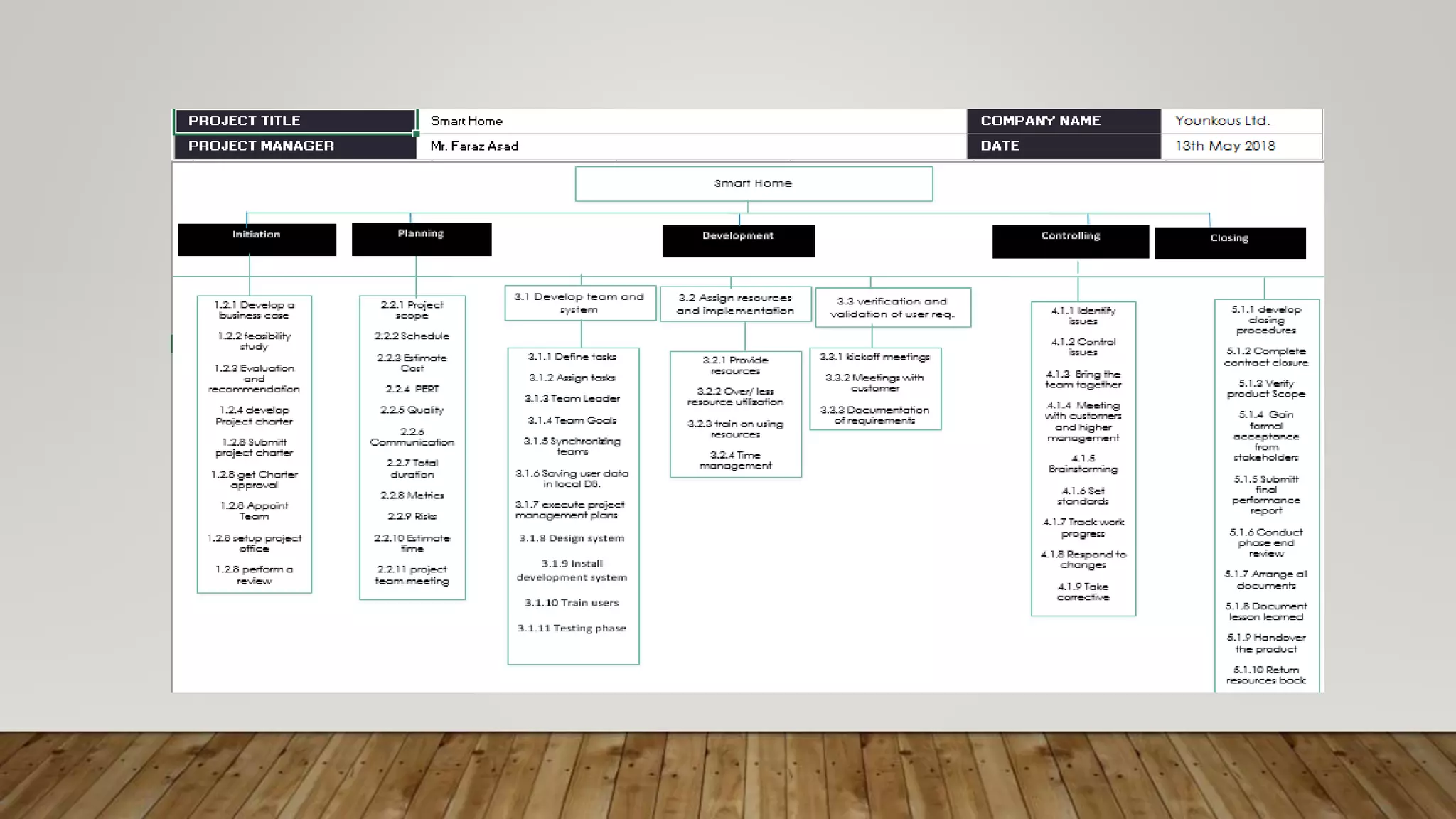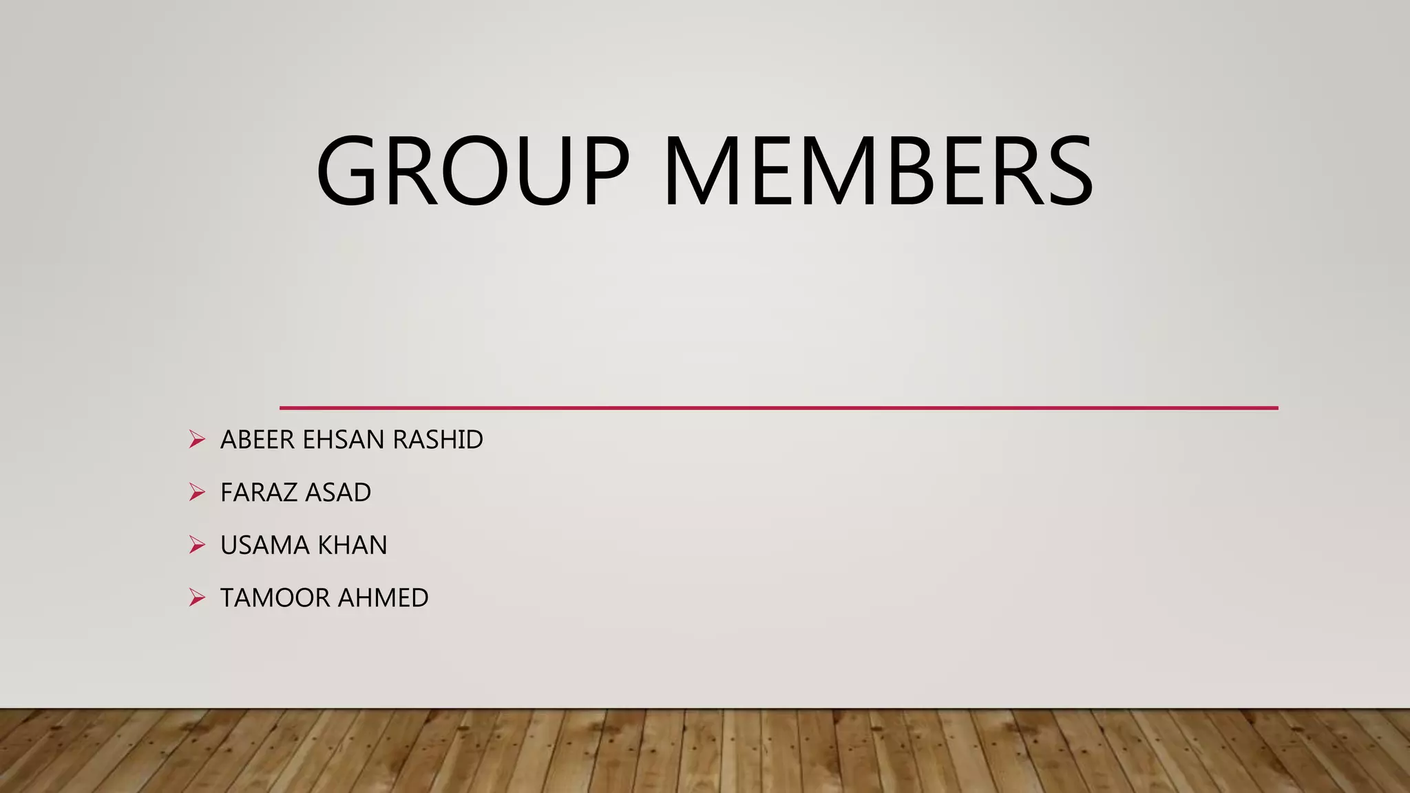 The document outlines a smart home project consisting of 4 group members: Abeer Ehsan Rashid, Faraz Asad, Usama Khan, and Tamoor Ahmed. The project aims to remotely control household appliances using a microcontroller for convenience and security. Key goals are to remotely access appliances, keep the house secure, and make everything controllable. The estimated 1-year scope includes security, light/temperature automation, and wireless control systems. Stakeholders include clients and sponsors, with Faraz Asad as project manager. Potential risks include electricity consumption, internet dependency issues, and lack of response without connectivity.