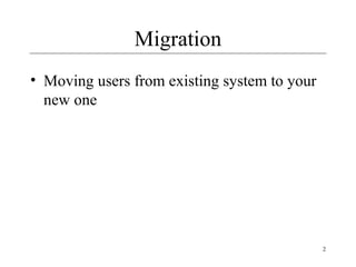 1) An overview of migration strategies including flash-cut, which involves an immediate replacement, and staged replacement of parts over time.