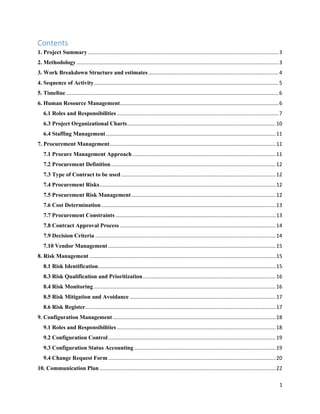 The document outlines a project plan for developing a web-based research collaboration platform, including a detailed work breakdown structure, team roles, methodology using agile and scrum approaches, and a comprehensive procurement management section. The project aims to enhance manuscript review processes, ensuring higher acceptance rates for researchers by promoting effective communication and collaboration among team members. Key sections include human resource management, risk management, change management, and quality assurance measures to ensure successful project execution within a four-month timeline.