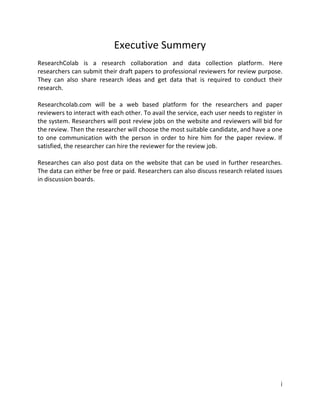 ResearchColab is a web-based platform designed for researchers to collaborate, share data, and review draft papers. The Software Requirements Specification (SRS) outlines the functional and non-functional requirements, stakeholder roles, and collaborative processes involved in developing this system. It serves as a foundational document to align the development team and stakeholders on the project's objectives and requirements.