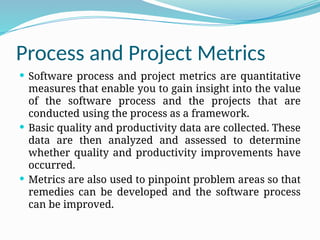 The document discusses software process and project metrics, which are quantitative tools to assess and improve software quality and productivity. It emphasizes the importance of measuring various attributes, deriving metrics for process improvement, and the role of management in utilizing these metrics effectively. Additionally, it categorizes metrics into different types, including size-oriented, function-oriented, and object-oriented, while highlighting the need for an organized approach to utilize these metrics responsibly.