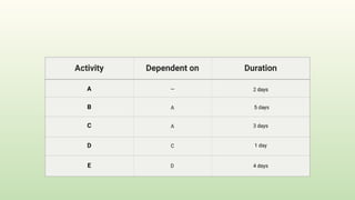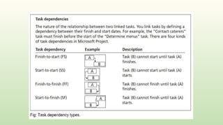 The document focuses on activity planning in project management, outlining objectives, types of activities, dependencies, and scheduling techniques. It covers key concepts such as critical path, forward and backward pass, resource allocation, and the importance of defining relationships between tasks. Tools like Gantt charts and techniques such as PERT and CPM are discussed for effective project scheduling and management.