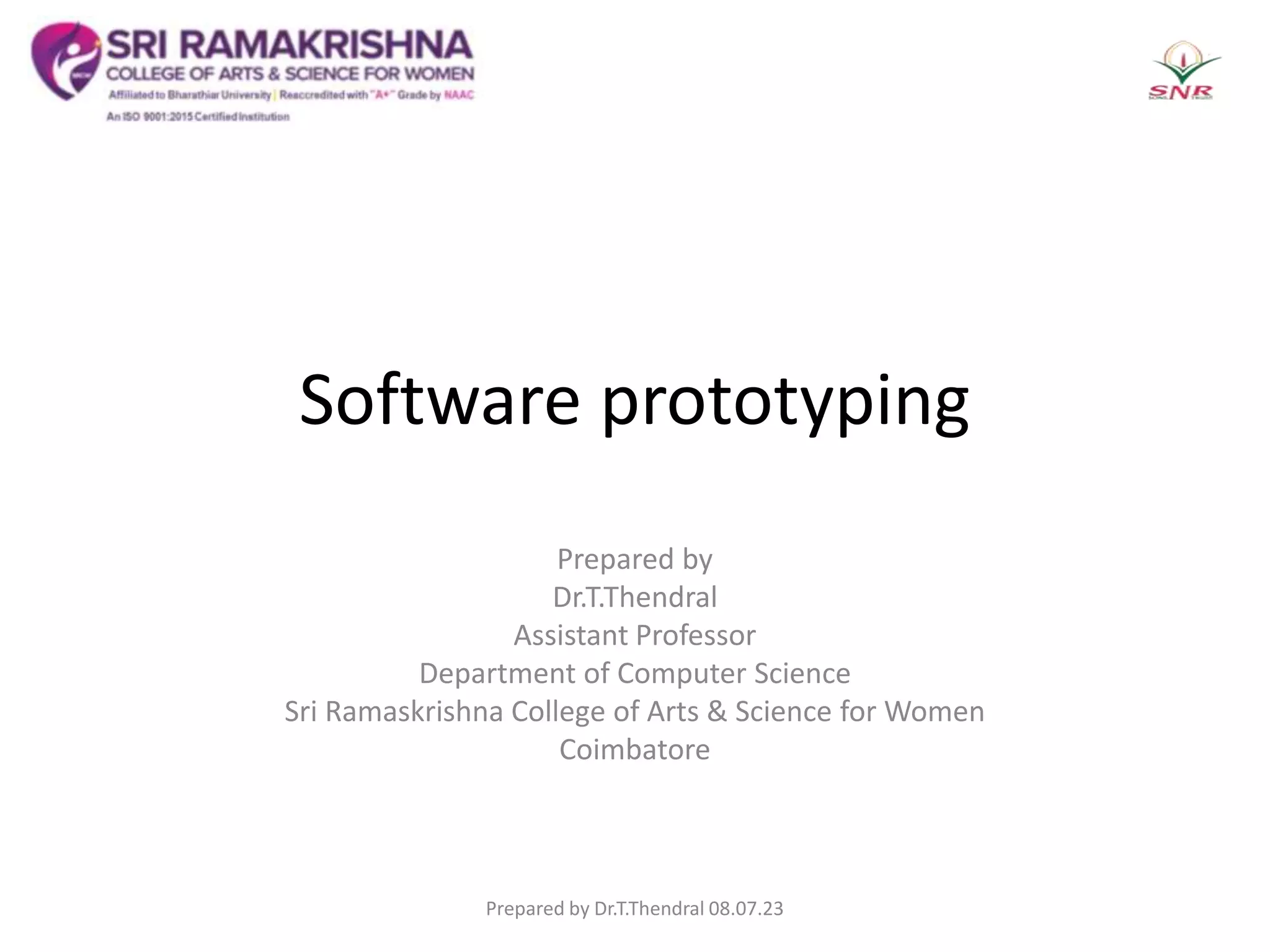The document provides an overview of software prototyping techniques. It discusses requirements elicitation and applying analysis principles to construct a prototype model of the software. It describes close-ended and open-ended prototyping approaches, and factors to consider for prototyping candidacy. Evolutionary and throwaway prototyping are defined in the context of the software development process. Methods and tools for prototyping like fourth generation techniques, reusable software components, and formal specification environments are also outlined.